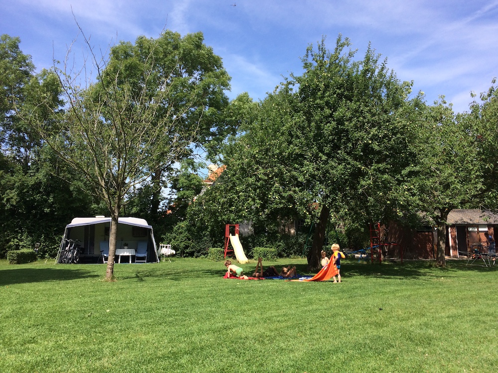 Een volwassen haag van struiken en enkele bomen rondom de camping maken het al snel behaaglijk. Een paar zonnestralen zijn genoeg om lekker buiten te kunnen vertoeven. Oude fruitbomen bieden op het kampeerveld een bloemenpracht in het voorjaar. In de zomer geven ze natuurlijke schaduw.